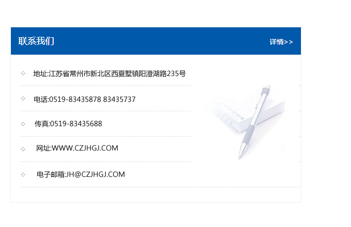 傳真:0519-83435688    郵編:213135    網址:WWW.czjhgj_com.haibotongxun.com    電子郵箱:JH@czjhgj_com.haibotongxun.com
